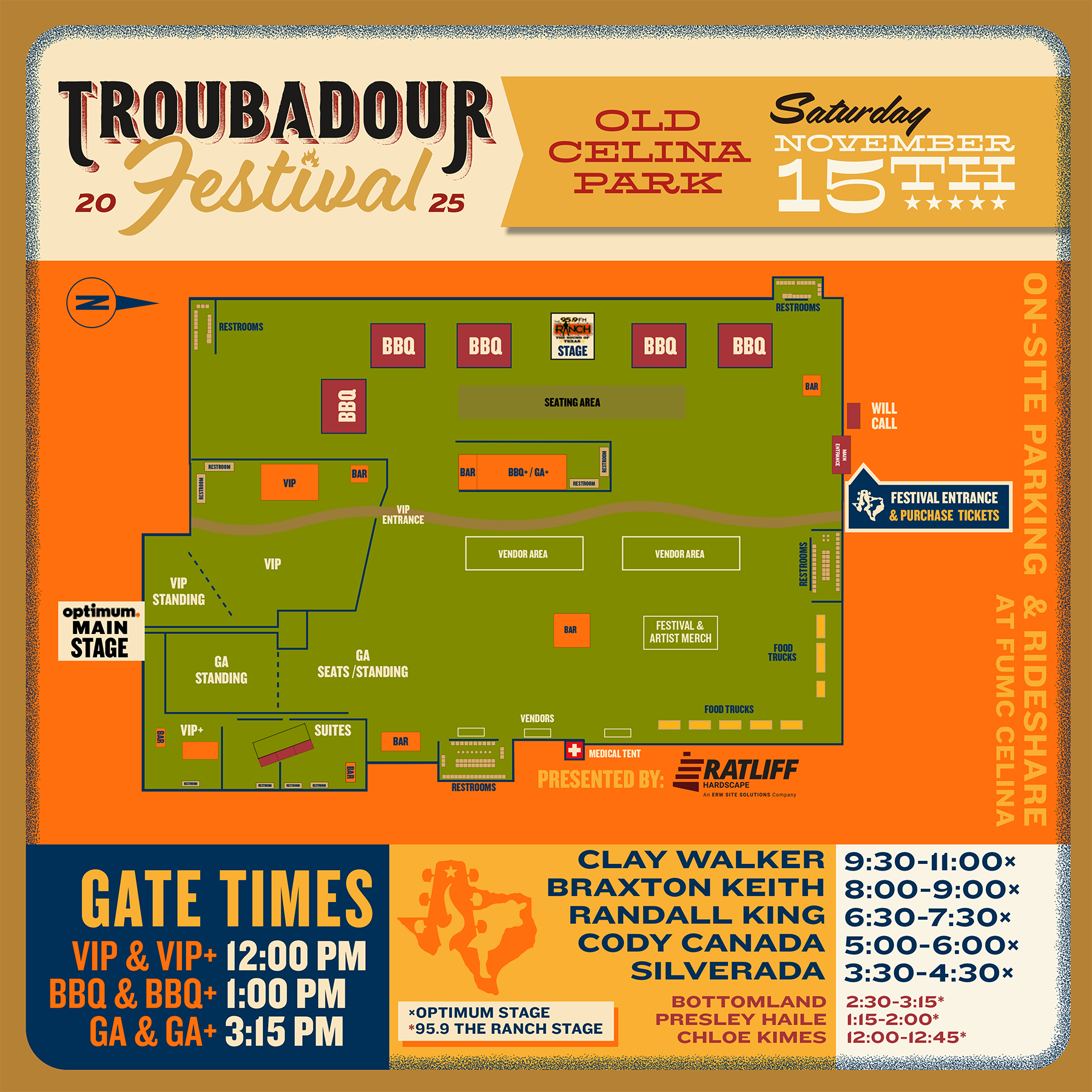 - The artist and barbecue restaurant lineups and set times are subject to change without notice. Tickets are for Troubadour Festival and not for a specific artist or barbecue restaurant. An artist and/or restaurant cancellation is not grounds for a refund.